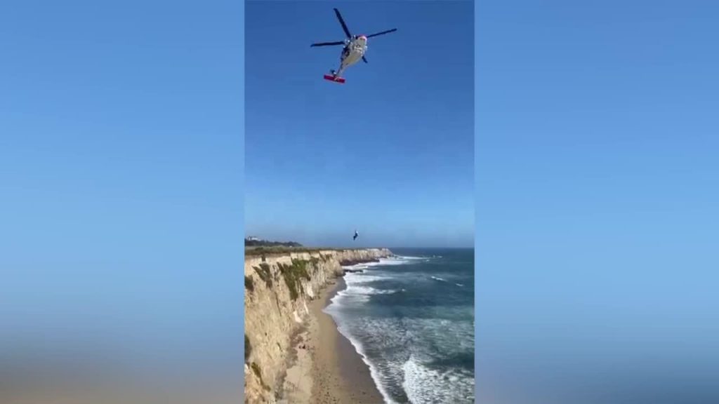 ASV Ziemeļkalifornijas glābēji no nomaļas pludmales izglābuši kaitsērfotāju, kas no akmeņiem smiltīs bija izlicis saucienu pēc palīdzības.