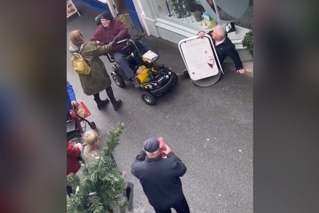 Sociālajos tīklos publicētajā video redzams, kā vīrietis dusmīgi vicina spieķi, dodoties pretī savam oponentam pa Millstrītu Devonā.