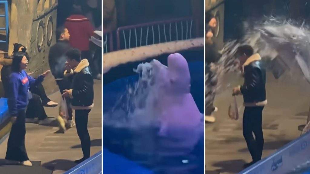 Ķīnā kāds negaidīts un amizants brīdis Daliaņas “Sunasia Ocean World” okeanārijā kļuvis par interneta hitu — video iemūžināts baltvalis, kurš ar precīzu ūdens strūklu nodzēš vīrieša aizdedzināto cigareti.