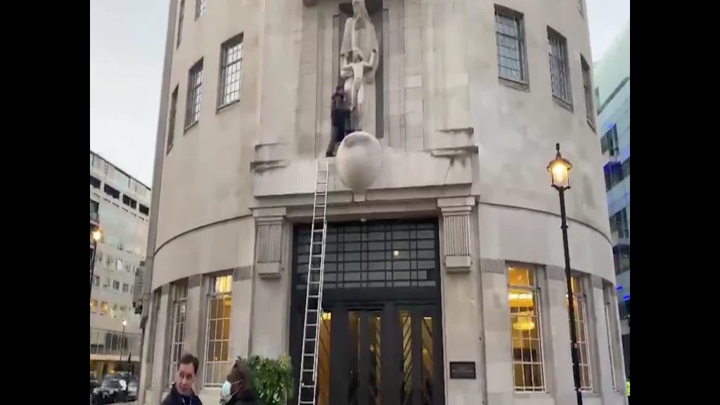 Aculiecinieku uzņemtajā videomateriālā redzams, ka vīrietis izmantojis saliekamās kāpnes, lai nokļūtu pie statujas, kas atrodas virs ieejas BBC ofisā.