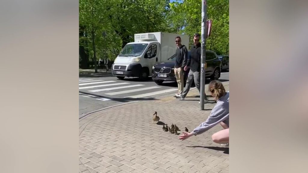 Video uzņemts 3. maijā pie Bastejkalna. Pīļu mātīte ar astoņiem pīlēniem soļo pa trotuāru līdz nonāk pie gājēju pārējas, kur pīļu mamma saminstinās un apstājas. Kāda garāmgājēja ar roku mājieniem mudina putnus šķērsot gājēju pāreju, kamēr uz ceļa esošās automašīnas ir apstājušās.