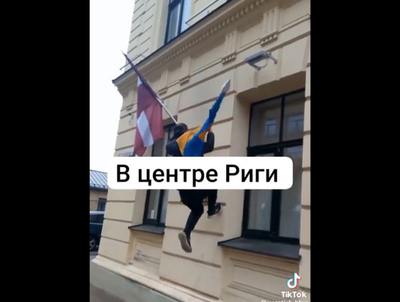 Soctīklā “X” šo otrdien, 9.aprīlī, izplatījies kāds video, kurā redzams, kā kāds vīrietis it kā Rīgas centrā uzrāpjas karoga mastā un lielā ātrumā ar lielu blīkšķi norauj Ukrainas karogu. Tas plīvoja pie ēkas mastā blakus Latvijas karogam.