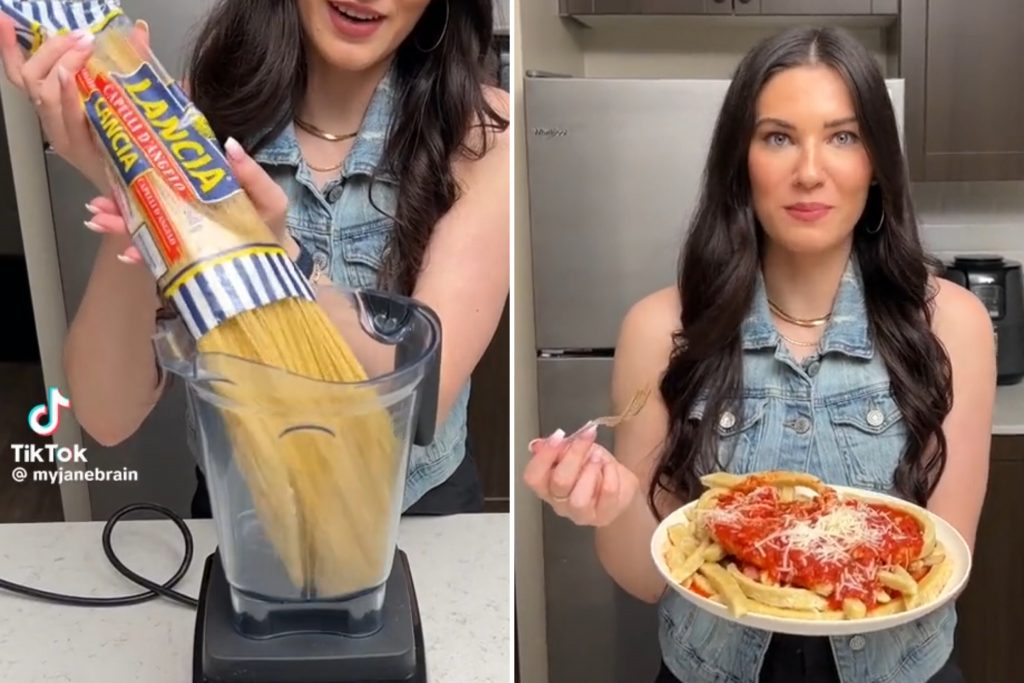 Kā redzams video, sieviete blenderī ieber veselu paku ar spageti makaroniem un sasmalcina tos. Pēc tam iegūto masu viņa izlīdzina kaudzītē un tās vidū iesit jēlu olu. Samaisot visu kopā, Džeina iegūst kaut ko līdzīgu mīklai.