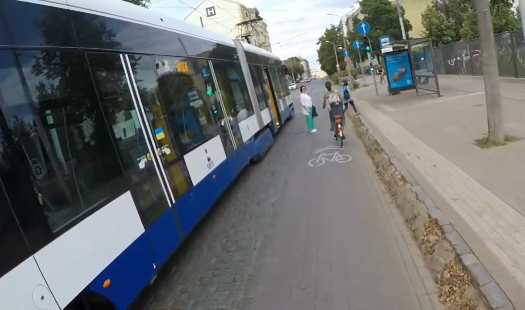 VIDEO. “Šī ir klasika!” Riteņbraucēja tramvaja pieturā klaji ignorē satiksmes noteikumus, kas attiecas ne tikai uz autovadītājiem 88