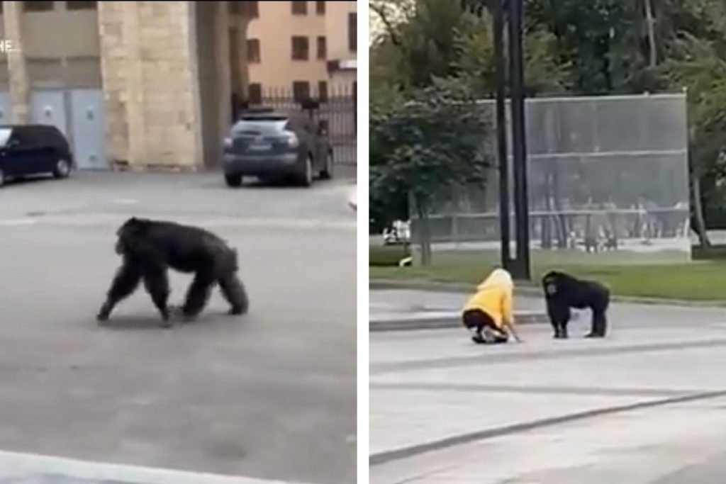 Dzīvnieka pastaigu nofilmējuši pilsētnieki. Sociālajos tīklos publicētajos videomateriālos redzams, kā šimpanze patstāvīgi šķērso ceļu netālu no Deržpromas un pastaigājas pa Ševčenko pilsētas dārzu.