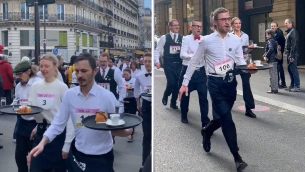 Atzīmējot neparasto tradīciju, simtiem viesmīļu pārpludināja Parīzes ielas, lai raitā solī divu kilometru garā distancē nestu paplātes.