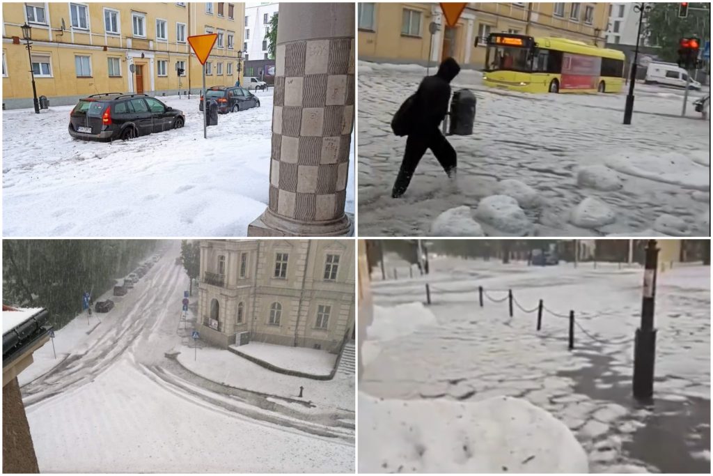 Raidorganizācijas TVN24 uzņemtajos attēlos redzami transportlīdzekļi un cilvēki, kas brauc pa ielām, pa kurām peld no masīvās krusas izveidojušies ledus gabali.