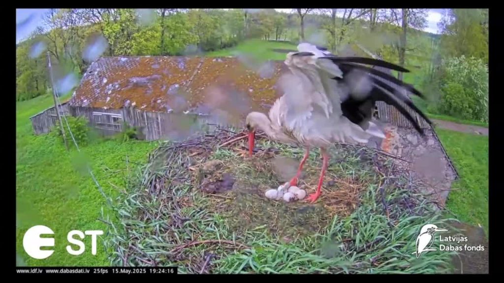 Balto stārķu ligzdā šogad tika izdētas piecas olas. Drīzumā gaidāma arī pārējo trīs stārķēnu šķilšanās.