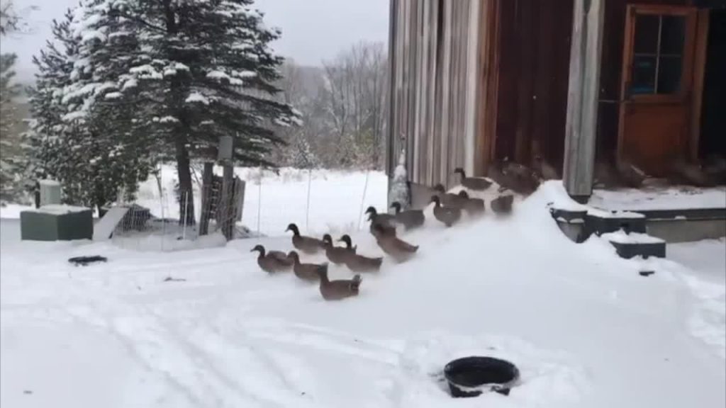 Neko ļaunu nenojauzdams, pīļu bars izskrien no ēkas. Brīdi pastāvējušas sniegā, pīles saprot, ka tas nu gan nebūs domāts viņām, un ātri metas atpakaļ iekšā siltajās fermas telpās.