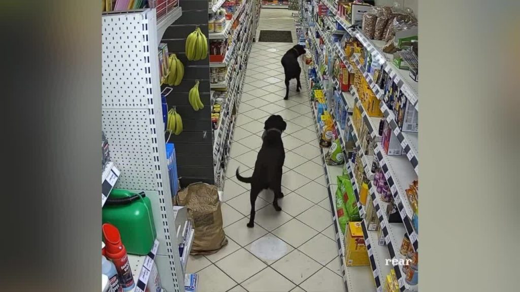 Palaidnīgie suņi pārlūkoja plauktus netālu no suņu barības stenda, līdz viens no viņiem pakampa maizes klaipu.