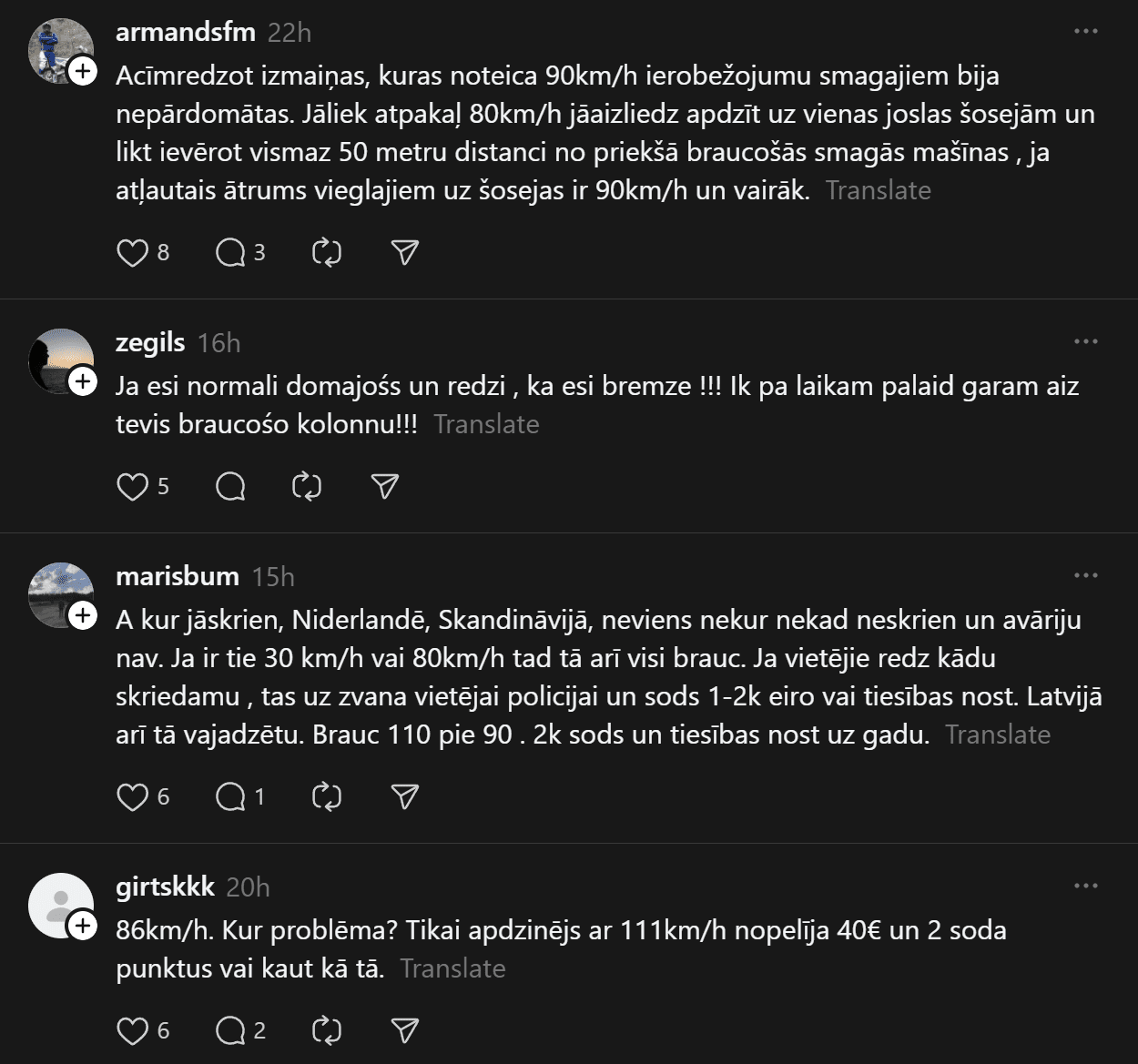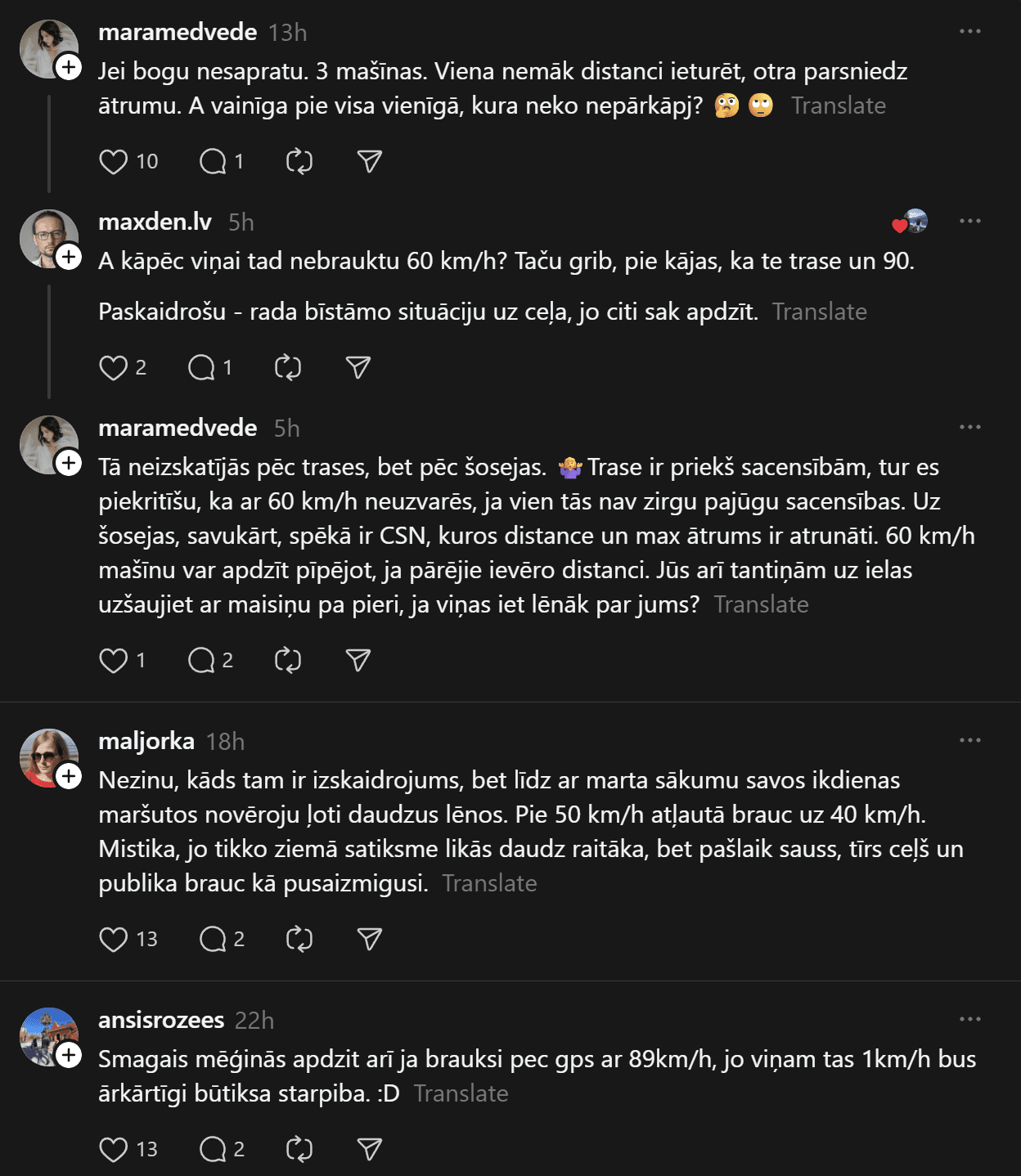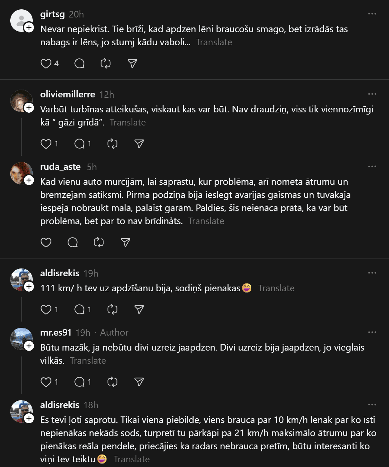 “Tu noteikti dari kaut ko nepareizi, ja smagais Tevi burtiski stumj uz priekšu. Apdzīšanas momentā distance vēl kaut cik, bija brīži kad smagais burtiski stūma vieglo. Tiešām ir jābrauc ~80kmh normālos apstākļos?” šoferis raksta.