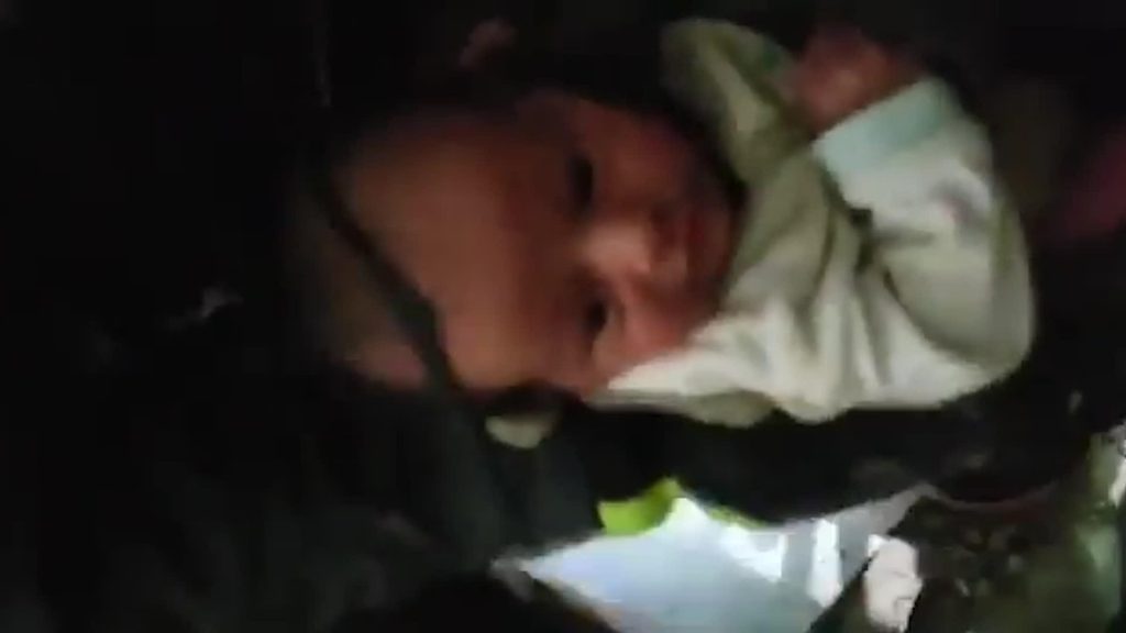 Aculiecinieka uzņemtajā video redzams, kā glābšanas dienesta darbinieki bērnu uzmanīgi izceļ no gruvešiem.