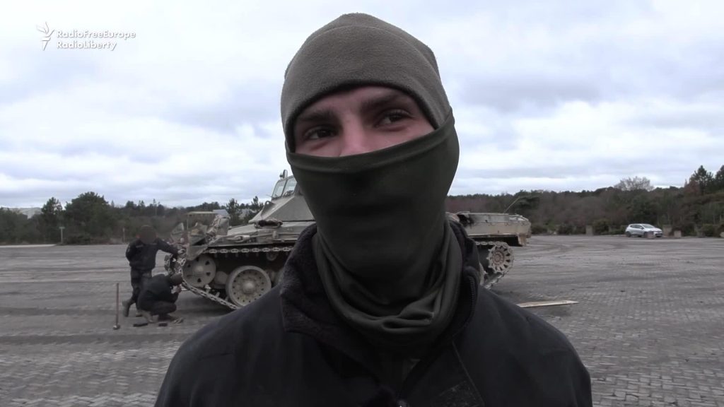 Medija “Radio Free Europe/Radio Liberty” korespondents Romāns Pahuļičs izklāsta apmācību norisi – tankā atrodas četri apmācāmie ar instruktoru. Kamēr viens brauc, pārējie trīs skatās.