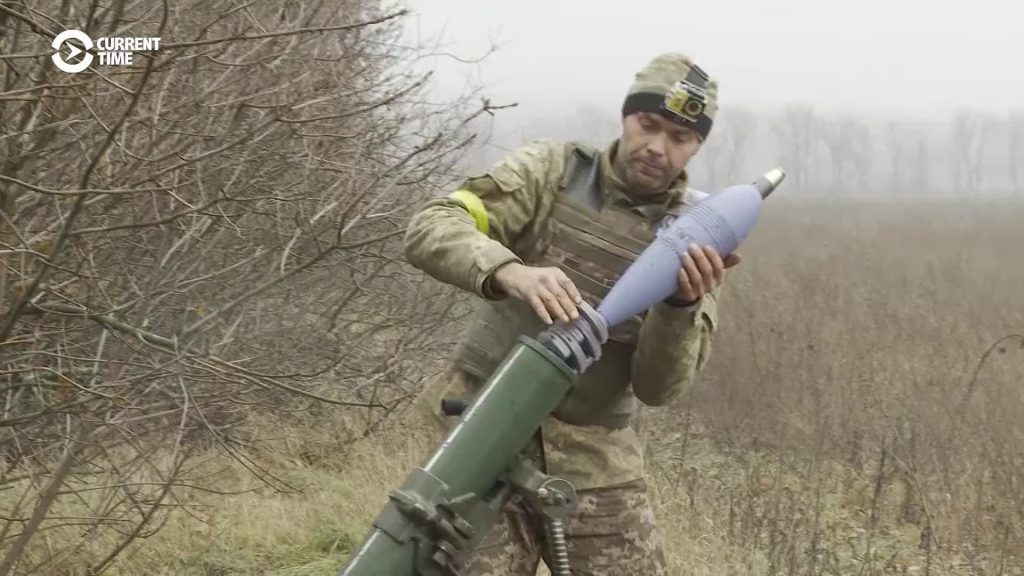 “Ukrainas izlūki pamanījuši ienaidnieka uzbrukuma vienību. Šī mīnmetēju vienība šauj, lai tos atstumtu,” video sākumā ziņo “Current Time” korespondents Andrijs Kuzakovs.