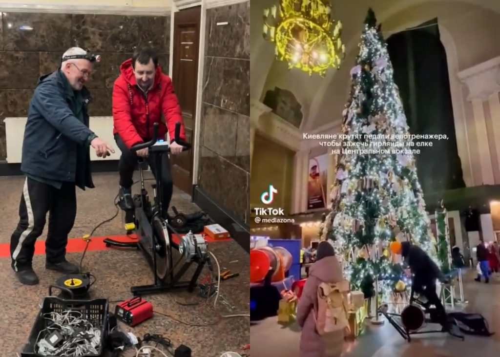 Ziemassvētku lampiņas kādā no Ukrainas galvaspilsētas dzelzceļa stacijām tiek darbinātas ar velotrenažiera starpniecību, kas ir smalks pretestības apliecinājums, iedzīvotājiem cīnoties ar Krievijas gaisa uzlidojumu izraisītajiem strāvas padeves pārtraukumiem.