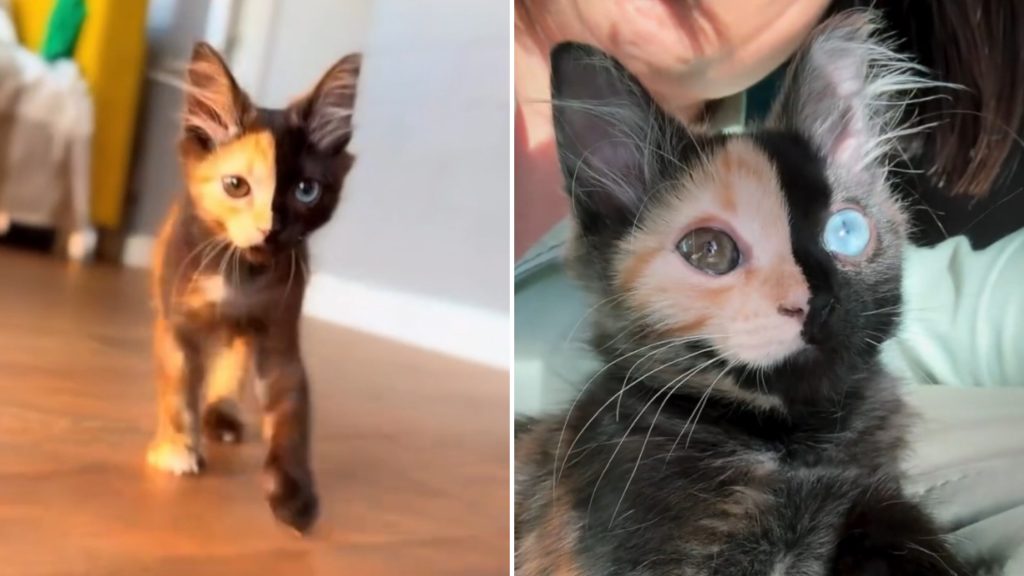 Pāris mēnešus vecs kaķēns Mantis piedzima ar iespaidīgu divkrāsainu purniņu – viena sejas puse ir melna, otra oranža, un viņam ir arī atšķirīgas acis.