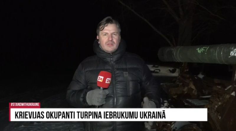 TV24 žurnālists Ansis Bogustovs, kurš šobrīd atrodas Ukrainā, raidījumā “Aktuālais par karadarību Ukrainā” stāsta, ka šobrīd atrodas Kijivas pievārtē, kurā apskatāma iznīcinātā okupantu tehnika.
