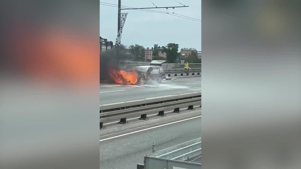 Aculiecinieku uzņemtajos video redzams, kā šodien ap plkst. 11:00 uz Salu tilta Rīgā ar atklātu liesmu degusi vieglā automašīna.