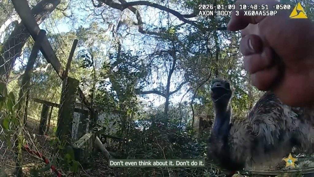 Par sociālo tīklu hitu kļuvis neparasts notikums Floridā, kur galvenajās lomās ir izbēdzis emu un šerifa vietnieks ar labu humora izjūtu.