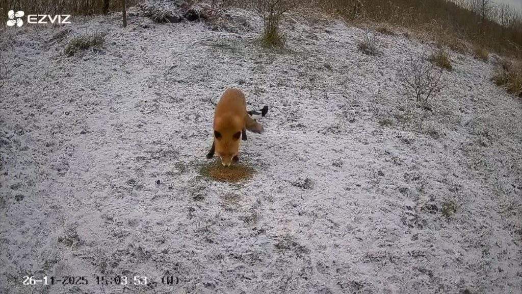 Taču lapsa, kurai šoreiz galvenais mērķis ir mierīgi paēst, ignorē nešpetno putnu un neļaujas provokācijām.