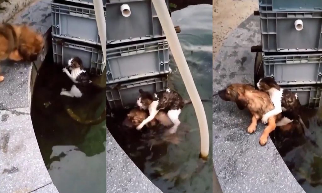 Nelaimē nonākušo dzīvnieku steidzas glābt divi suņi – drosmīgākais no tiem ielec ūdenī par spīti kaķa mēģinājumiem viņam ieskrāpēt.