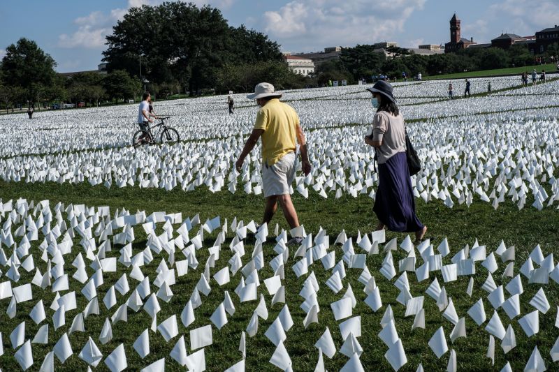 Pie Vašingtonas monumenta, ASV izveidota vairāk nekā 660 000 baltu karogu jūra – katrs plīvojošais karodziņš piemin ikvienu amerikāni, kas zaudējis cīņu ar Covid-19. Instalācijas organizatori ir aicinājuši apmeklētājus personalizēt un veltīt karodziņus viņiem tuvu zaudēto cilvēku piemiņai.