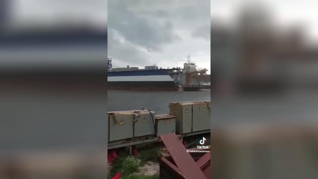 Video redzams, ka spēcīgais vējš no tauvām norāvis sauso doku un pamatīgi šūpo masīvo celtni.