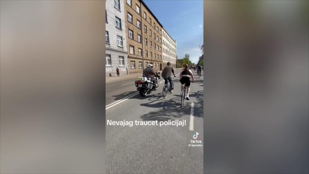 Sociālo mediju platformā “X” ievietotajā video redzams, kā riteņbraucējs izbrauc priekšā Valsts policijas darbiniekam, kurš ar motociklu brauca pa atdalošo joslu, tādējādi kontrolējot riteņbraucējus, lai tie neiebrauktu pretējā virzienā.
