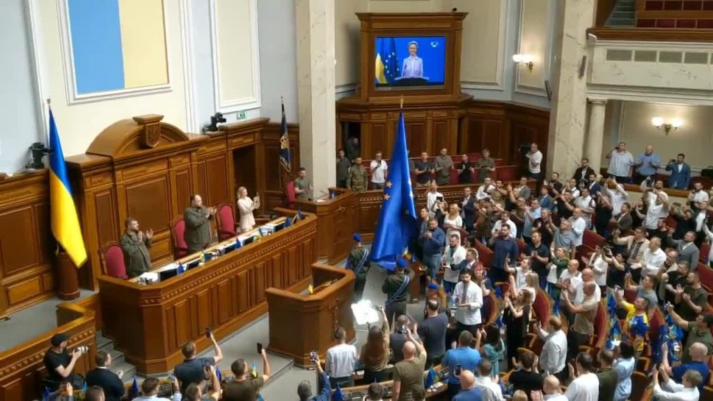 “Ukrainai tagad ir ļoti skaidra Eiropas perspektīva,” pēc Eiropas Savienības lēmuma piešķirt valstij kandidātvalsts statusu, lai pievienotos blokam, šorīt uzrunā Ukrainas parlamentam sacīja Eiropas Komisijas prezidente Urzula fon der Leiena.