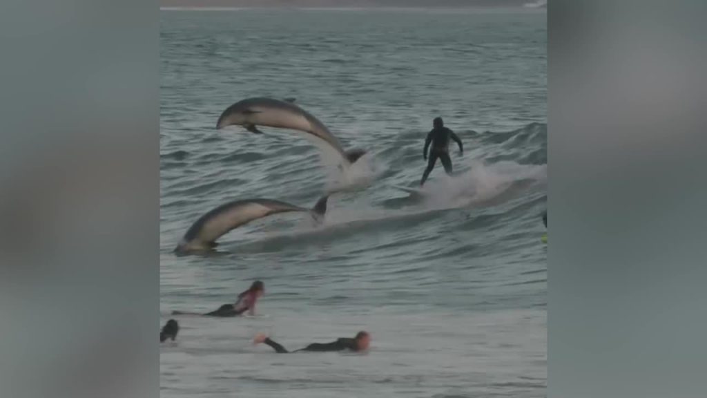 Sērfotāji Kalifornijā piedzīvojuši neaizmirstamu pārsteigumu, kad ķerot viļņus Rinkonas pludmalē, viņiem pievienojās delfīni.