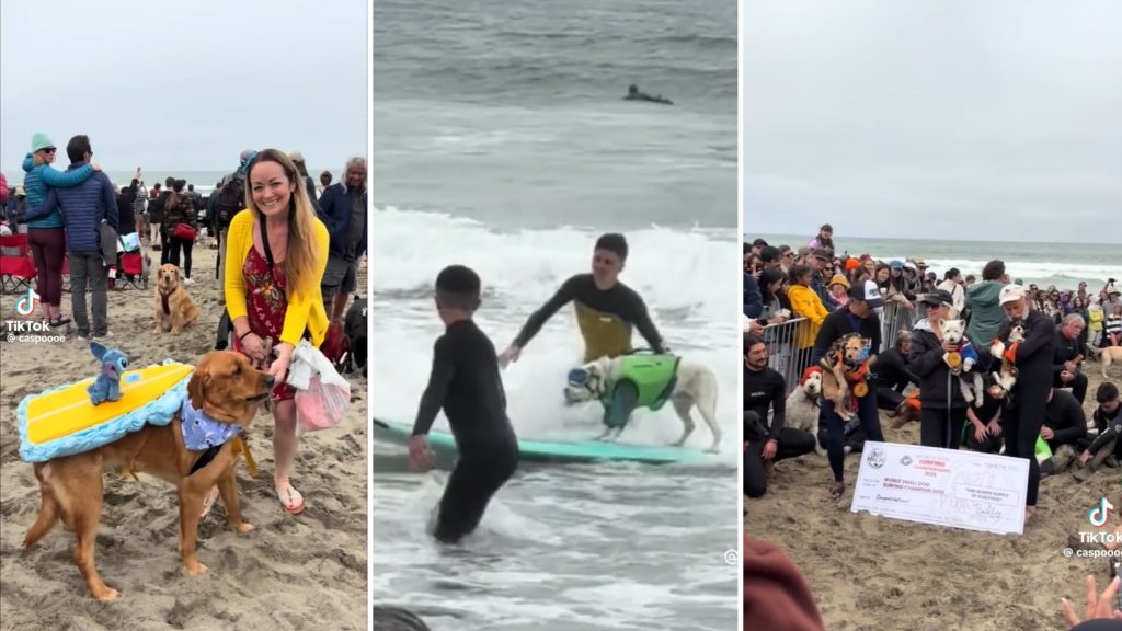 Šīs neparastās sacensības piesaistīja tūkstošiem skatītāju pludmalē netālu no Sanfrancisko. Viļņos devās dažādu šķirņu suņi — labradori, terjeri, spanieli un citi.