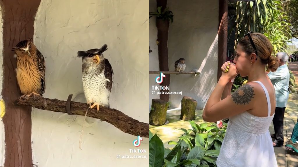 Vietnē “TikTok” publicētajā video redzama sieviete, kas, stāvot pie pūču voljēra, svilpojot precīzi atdarina pūču saucienus.