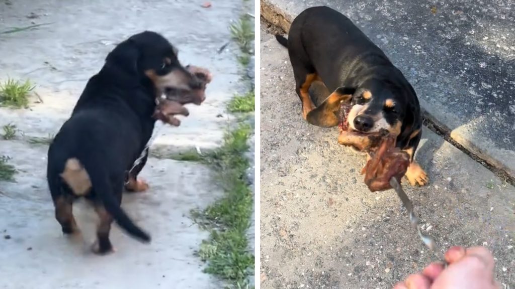 Video redzams, kā šis nelielais, bet pašpārliecinātais suņuks mierīgā, gandrīz majestātiskā gaitā dodas prom, cieši zobos turot iesmu ar vairākiem kārdinoši ceptiem šašlika gabaliem.