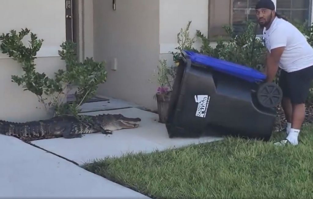 Internetā strauju popularitāti guvis video, kurā drosmīgs vīrietis ar atvērtu atkritumu konteineri tuvojas paliela izmēra aligatoram, kas iemaldījies dzīvojamo māju rajonā Floridā, ASV.