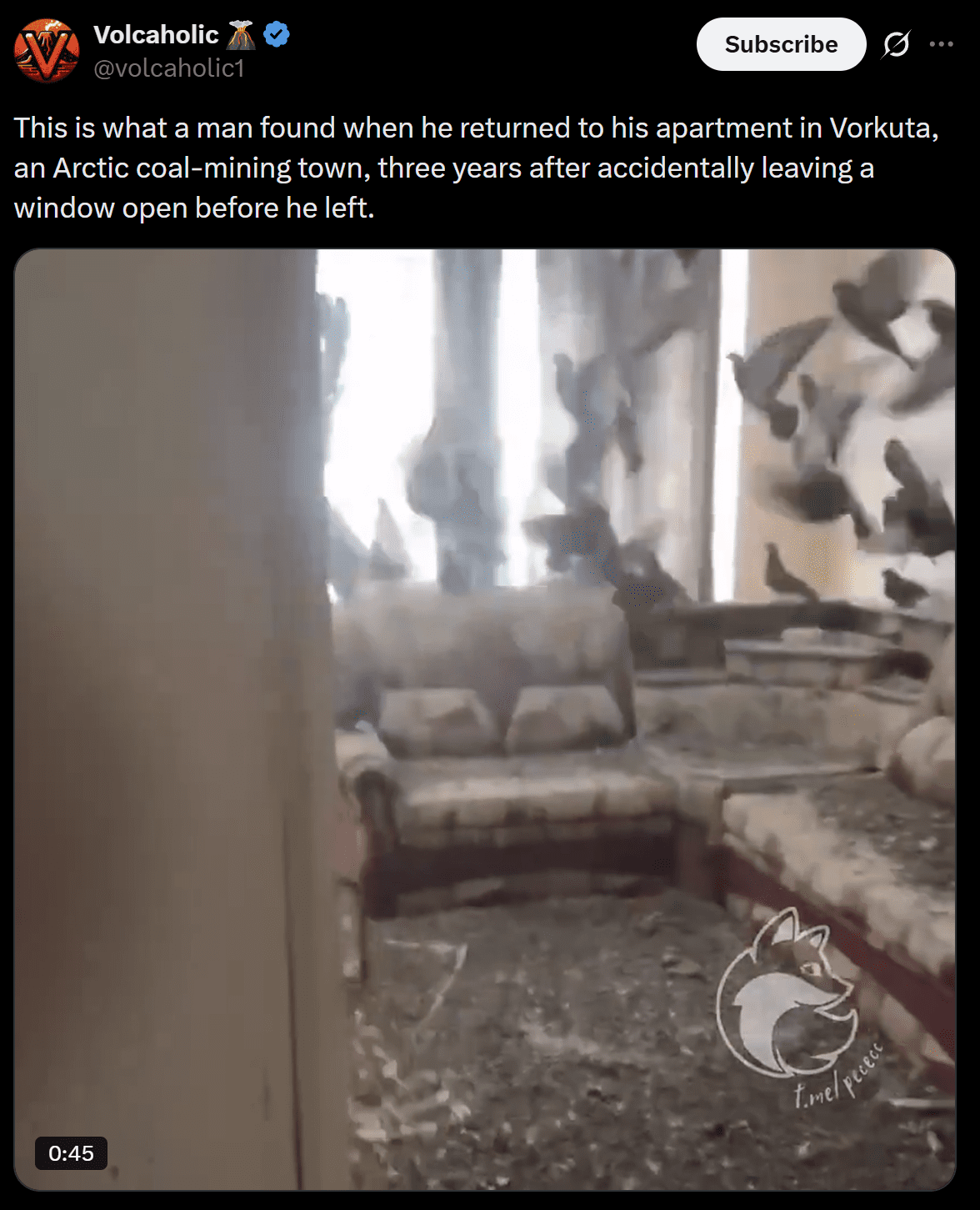 Papildu jau iepriekšminētajām lietām, ir vēl kāds “bīstams” iznākums, ja ilgstoši būs atvērts logs. Ar šādu pieredzi vietnē “X” dalījies kāds soctīklotājs. Lūk, video, kas notika ar viņa dzīvokli, vairākus gadus atstājot vaļā atvērtu logu. “Lūk, ko kāds vīrietis “atrada”, kad viņš pēc trim gadiem atgriezās savā dzīvoklī Vorkutā – Arktikas ogļrūpniecības pilsētā – pēc tam, kad, dodoties prom, bija nejauši atstājis logu atvērtu,” teikts publikācijā.