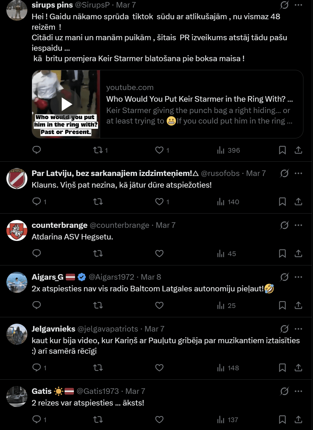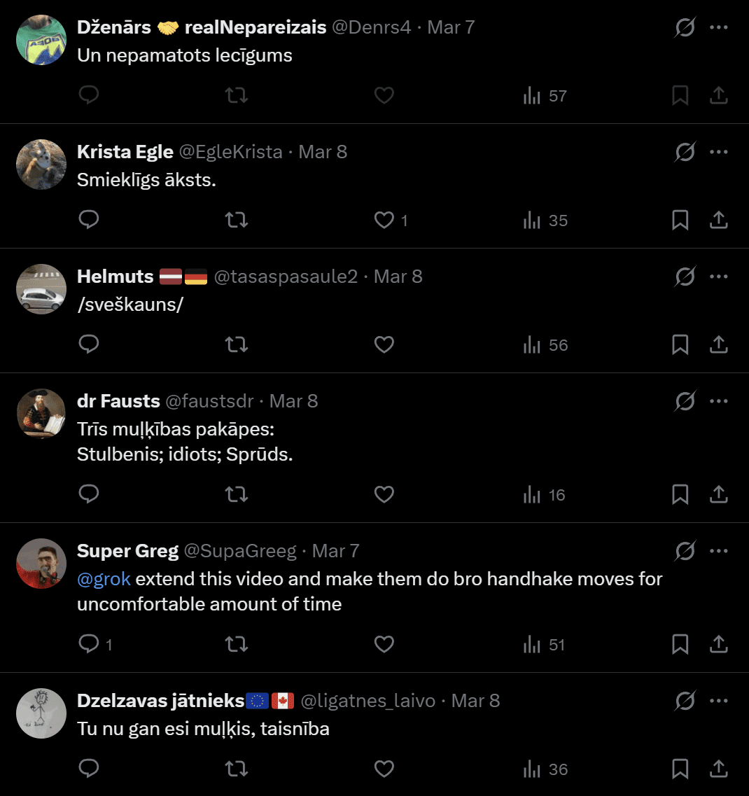 “Arī Latvijā tagad ir savs “tiktok kareivis” – Andris Sprūds! Aizsardzības ministra uzstāšanās TikTok atgādina Kadirova vienību maršus sociālajos tīklos — bravūra vārdos un darbos, ar ko ministrs mēģina radīt spēka un kompetences iespaidu. Patiesībā tā esot gļēvulība, zināšanu trūkums, neizlēmība un izvairīšanās no atbildības,” kāds komentētājs rakstīja X. Bet Lauris atspēkoja, norādot “Visu cieņu!” “Cik reizes vari piepumpēties? Abas,” vietnē X ironizē Ingus. Cits rakstīja, ka vajadzēja vismaz 50 reizes, tad būtu par ko uzslavēt!