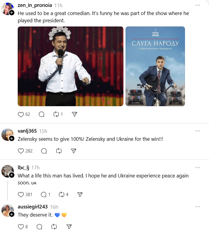 “Viņš bija (un, iespējams, joprojām ir!) lielisks komiķis un aktieris. Ilgi pirms viņa ievēlēšanas par Ukrainas prezidentu viņš rakstīja un pats arī spēlēja galveno lomu televīzijas seriālā “Tautas kalps”. Tajā viņš atveido skolotāju, kurš jokojot kļūst par prezidentu – klasiska sižeta līnija par godīgu, vienkāršu cilvēku, kurš nonāk amatā un mēģina uzlabot valsts situāciju, pilna ar smieklīgām ainām un asiem, patiesiem komentāriem par Ukrainas realitāti. Šeit Kanādā šis seriāls jau vairākus gadus ir skatāms Netflix.”
