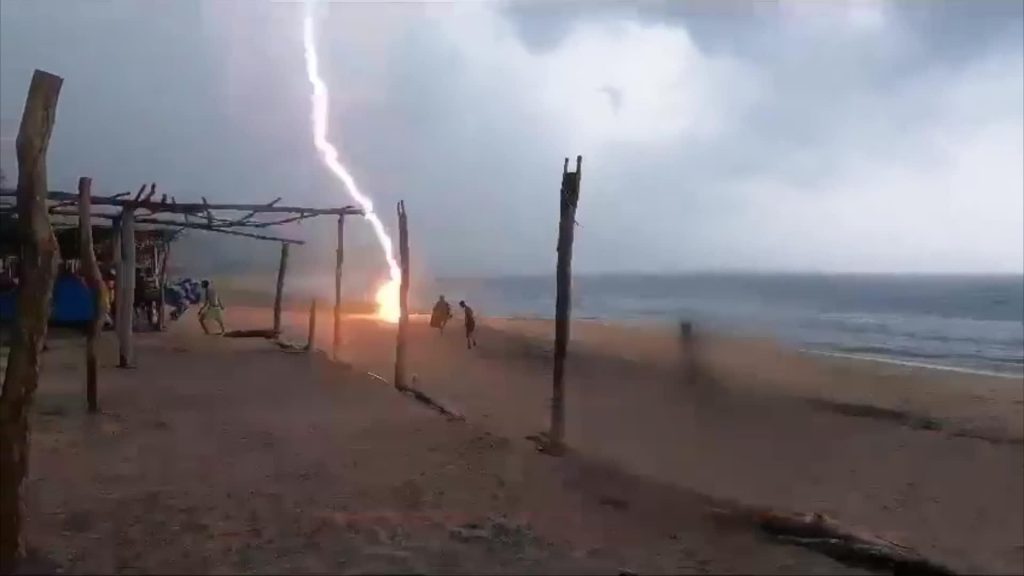 Sociālajos tīklos publicētajā video redzams brīdis, kad pludmales apmeklētāji vāca mantas, lai steigšus dotos prom pirms draudīgi tuvojošās vētras. Brīdi vēlāk divus no viņiem ķēra zibens spēriens un viņi palika guļam smiltīs.