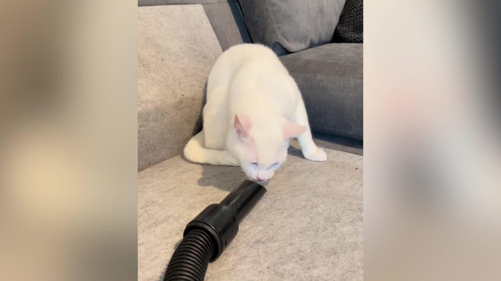 VIDEO. Ziņkārīgam kaķim pirmā sastapšanās ar putekļu sūcēju beidzas ar garu degunu 3