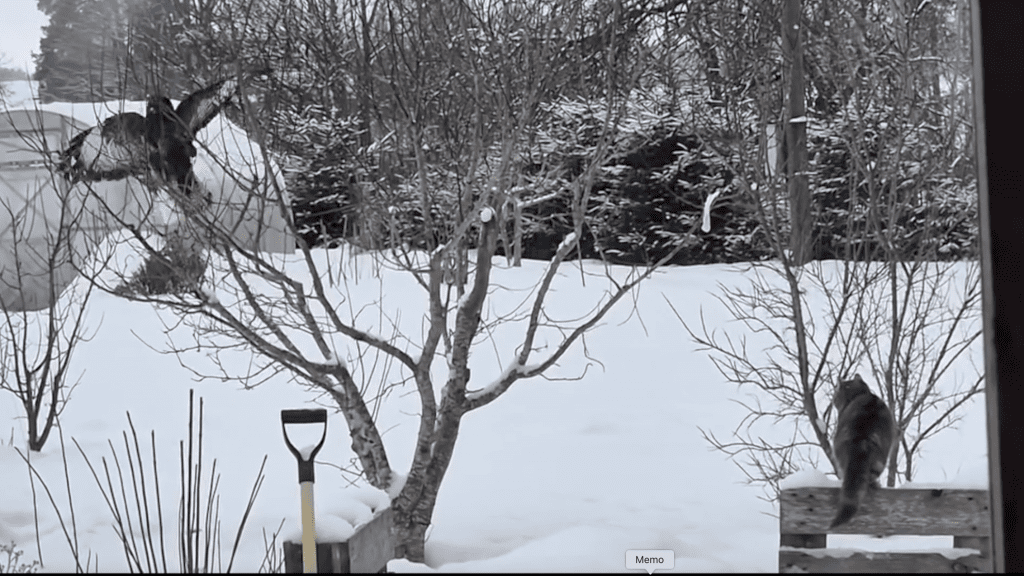 Vēl kādā video kadrā parādās arī mājas kaķis, kurš no droša attāluma vēro speķa ēdājus. Kaķa interese ir acīmredzama, taču pietuvoties plēsīgajiem putniem tas tomēr nesteidzas.