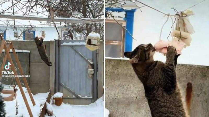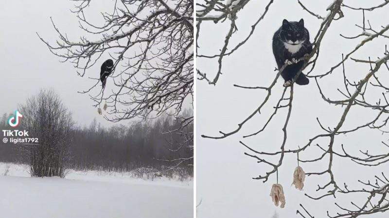 Kaķa cīņa par speķi: neveiklā misija koka zaros