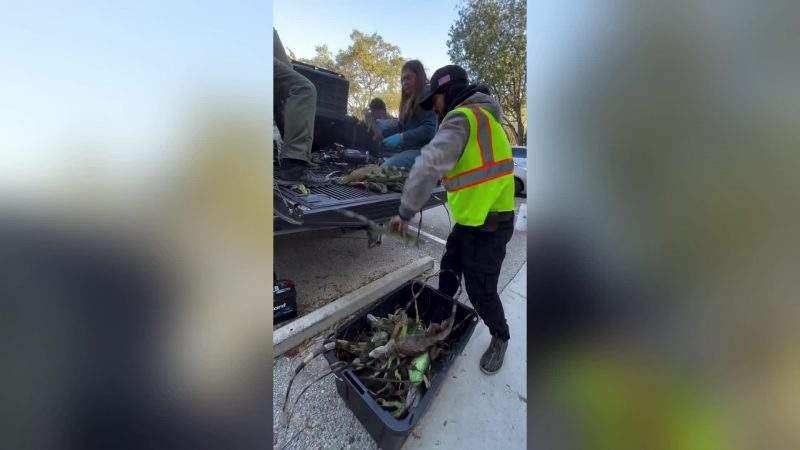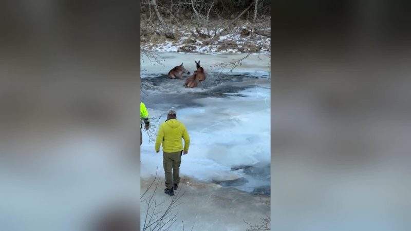 Glābēji palīdz trim briežiem nokļūt krastā no ledus slazda