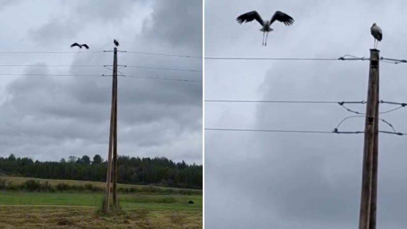 Drosmīgs stārķis trenē līdzsvaru uz elektrolīnijas