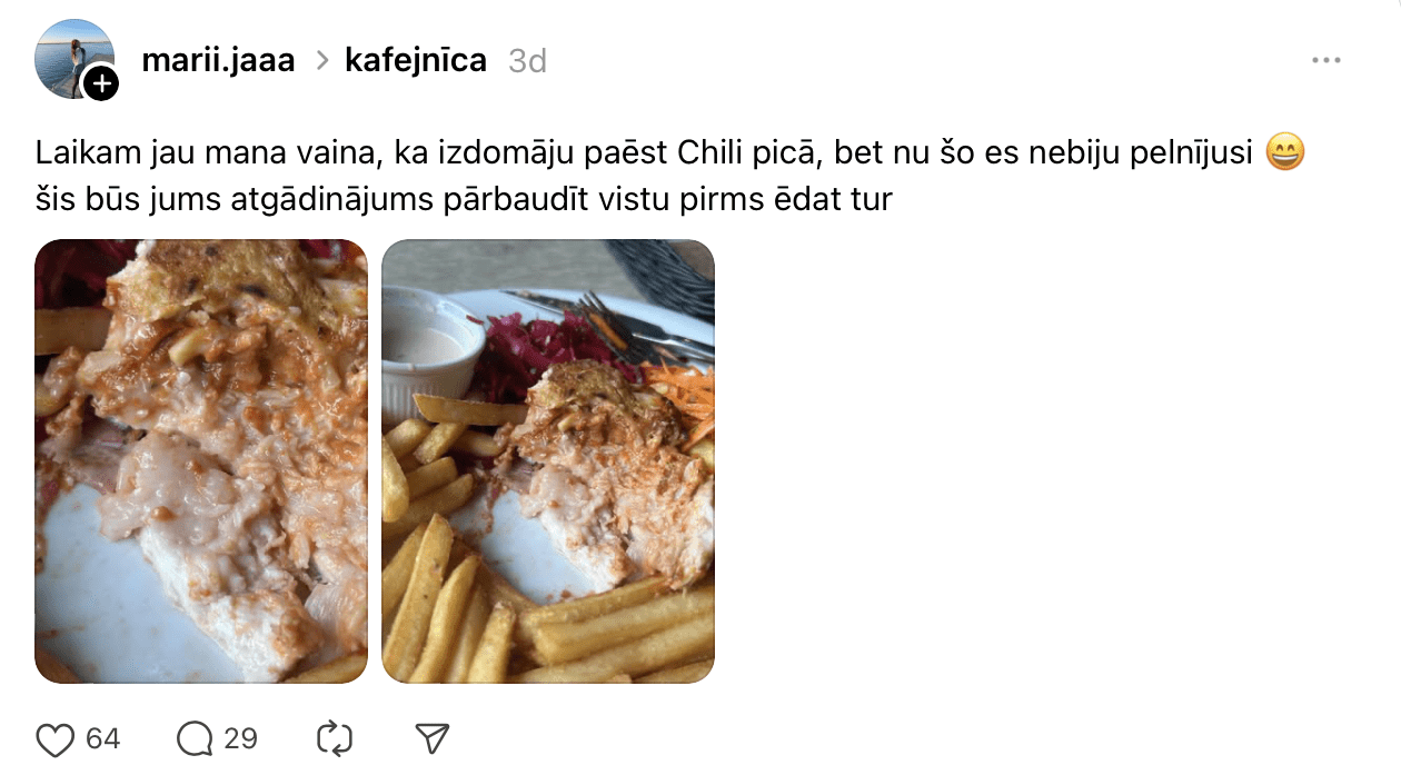 Komentāros atrodama arī “Čili picas” atvainošanās. Viņu komanda raksta: “Paldies, ka ziņojāt. Atvainojamies par šādu pieredzi – pagatavotais ēdiens neatbilst mūsu kvalitātes standartiem. Vai varētu lūgt precizēt, kurā picērijā un kad pasūtījāt ēdienu? Vēlreiz – ļoti atvainojamies par nepatīkamo situāciju.”