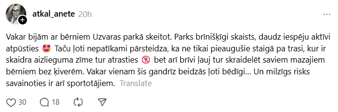 “Vakar bijām ar bērniem Uzvaras parkā skeitot. Parks brīnišķīgi skaists, daudz iespēju aktīvi atpūsties. Taču ļoti nepatīkami pārsteidza, ka ne tikai pieaugušie staigā pa trasi, kur ir skaidra aizlieguma zīme tur atrasties, bet arī brīvi ļauj tur skraidelēt saviem mazajiem bērniem bez ķiverēm. Vakar vienam šis gandrīz beidzās ļoti bēdīgi… Un milzīgs risks savainoties ir arī sportotājiem,” vēstīja Uzvaras parka apmeklētāja.