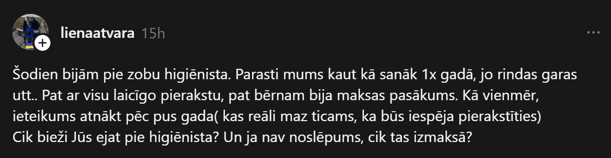 “Šodien bijām pie zobu higiēnista. Parasti mums kaut kā sanāk 1x gadā, jo rindas garas utt.. Pat ar visu laicīgo pierakstu, pat bērnam bija maksas pasākums. Kā vienmēr, ieteikums atnākt pēc pus gada (kas reāli maz ticams, ka būs iespēja pierakstīties)