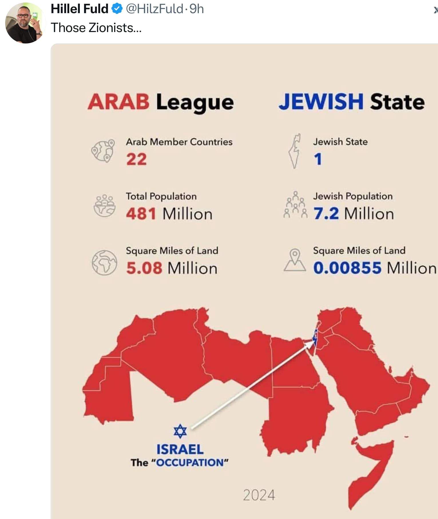 Pasaulē ir 22 arābu valstis un tikai viena izraēliešu. Arābu valstu kopējā platība ir 13 000 000 kvadrātkilometru. Izraēlas teritorija ir 22 000 kvadrātkilometru starp Jordānas upi un Vidusjūru. Tātad Izraēlas teritorija “no upes līdz jūrai” ir 590 reizes mazāka par arābu valstu kopējo platību. Kartē tas mazais zilais punktiņš, uz kuru norāda balta bulta, ir Izraēla. Un šis zilais punktiņš, kā kreisie aktīvisti grib mums iestāstīt, “nāvīgi apdraud” arābu pasauli, kas kartē iezīmēta ar sarkanu.