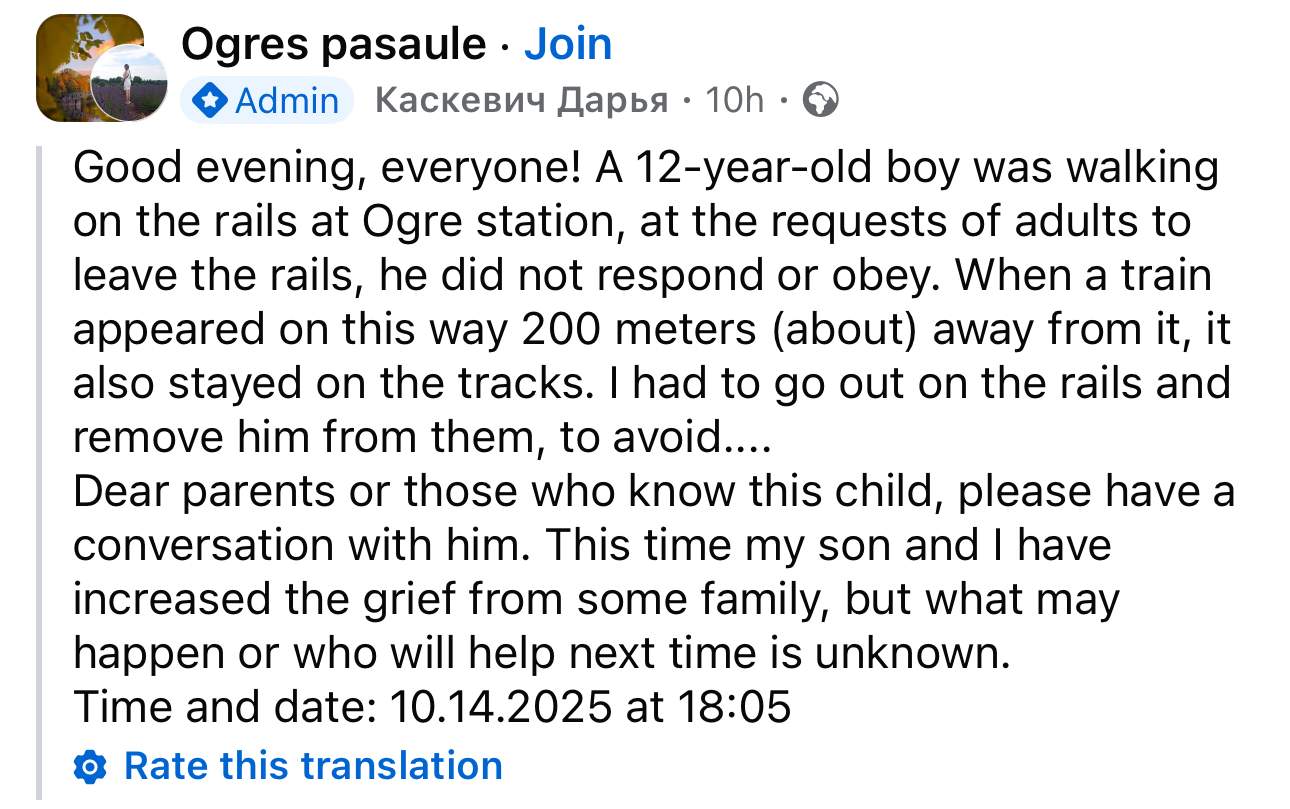 Darja dalās ar notikušā aprakstu: “Ogres stacijā pa sliedēm staigāja 12 gadus vecs zēns. Pēc pieaugušo lūguma atstāt sliedes viņš neatsaucās un nepakļāvās. Kad vilciens šajā ceļā parādījās apmēram 200 metru attālumā no zēna, viņš arī palika uz sliedēm. Man vajadzēja iziet uz sliedēm un noņemt viņu no tām, lai izvairītos [no negadījuma]…