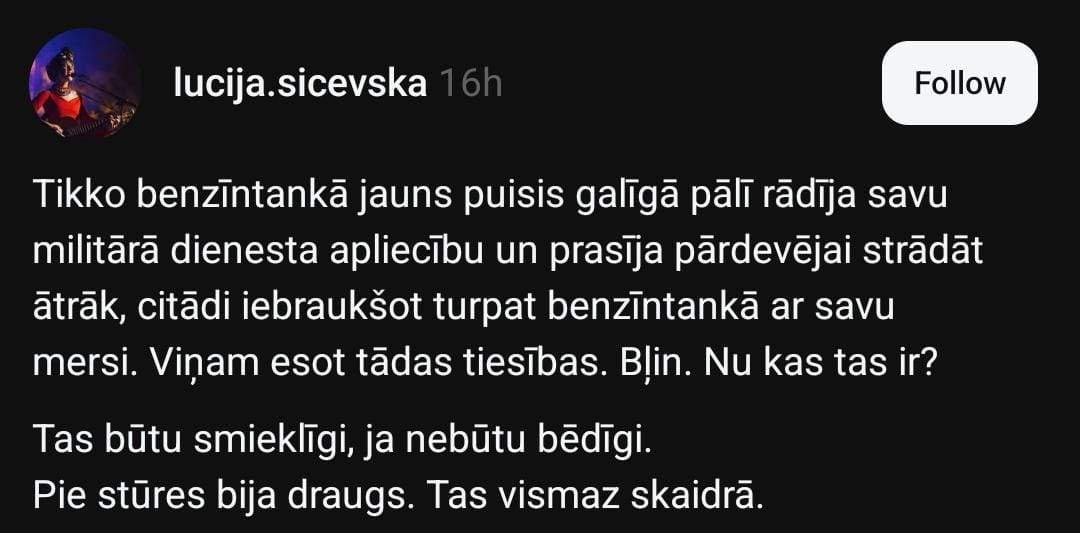 “Viņš rādīja savu militārā dienesta apliecību un pieprasīja pārdevējai strādāt ātrāk, citādi iebraukšot turpat benzīntankā ar savu “Mercedes”. Viņam esot tādas tiesības. Bļi*. Nu kas tas ir? Tas būtu smieklīgi, ja nebūtu bēdīgi,” stāsta Lūcija.