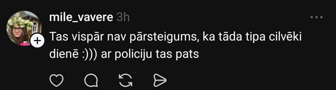 Savukārt citi sociālo tīklu lietotāji uzsver, ka vajadzējis piefiksēt vīrieša vārdu, jo par šādiem gadījumiem ir jāziņo. Ieva komentāru sadaļā raksta: “Nākamreiz pasaki, ka izsauksi policiju – viņi arī grib redzēt to apliecību! Nav vairs tie laiki, kad ar dienesta apliecību var tikt cauri sveikā!”